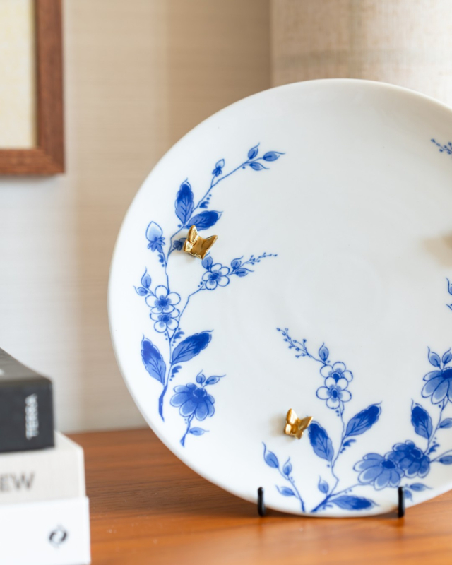 De combinatie van het traditionele bloemmotief en de moderne, glanzende vlinders geeft dit bord een unieke samensmelting van traditioneel en vernieuwend.